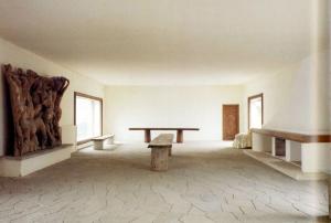 Aquilo que foi construído mais parece uma tipologia da antiguidade do que uma do movimento moderno. Assim, ao primeiro piso, entra-se directamente num grande sala que ocupa toda a largura do edifício. Centralmente e no lado mais comprido da sala, uma lareira suavemente curva que vá até ao tecto, é o elemento chave que hierarquiza o espaço.